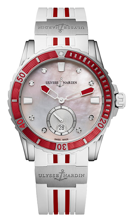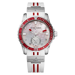 8. Ulysse Nardin Diver Lady 3203-190-3R/10.16 Корпус из полированной нержавеющей стали. Безель с красным вулканизированным каучуковым покрытием и одним бриллиантом весом 0,013 карата. Белый перламутровый циферблат с центральными стрелками часов и минут, малой секундной стрелкой, окошком даты, с условными накладными индексами, восемь из которых являются бриллиантами общим весом 0,062 карата. Белый каучуковый ремешок с двумя красными полосками, вставками из нержавеющей стали с логотипом Ulysse Nardin и раскладывающейся стальной застёжкой. |