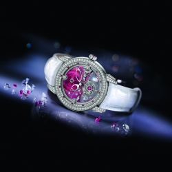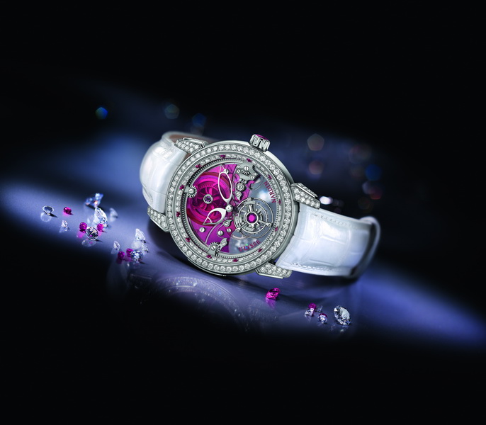 Новые часы «Royal Ruby Tourbillon» – усыпанный бриллиантами изысканный образец высокого часового искусства, созданный с использованием переливающихся красным свечением драгоценных рубинов огранки «багет» и на основе их мощной энергетики, рвущейся из глубины веков. Рубиновый шедевр будет оберегать свою владелицу от недругов, дарить силу, бесстрашие и мудрость, рождать любовь и стремление к совершенству до тех пор, пока механизм часов отсчитывает время с непревзойдённой точностью.